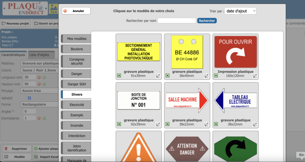 En cliquant sur « Modèle », vous accédez aux modèles standards disponibles pour tous les utilisateurs. Ceux-ci couvrent les usages courants tels que la signalisation des machines, la signalisation solaire et d’autres catégories fréquemment utilisées. Chaque modèle comprend des couleurs, des pictogrammes et des mises en page de texte prédéfinis. Il vous suffit de choisir un modèle et d’ajuster les détails selon vos besoins.