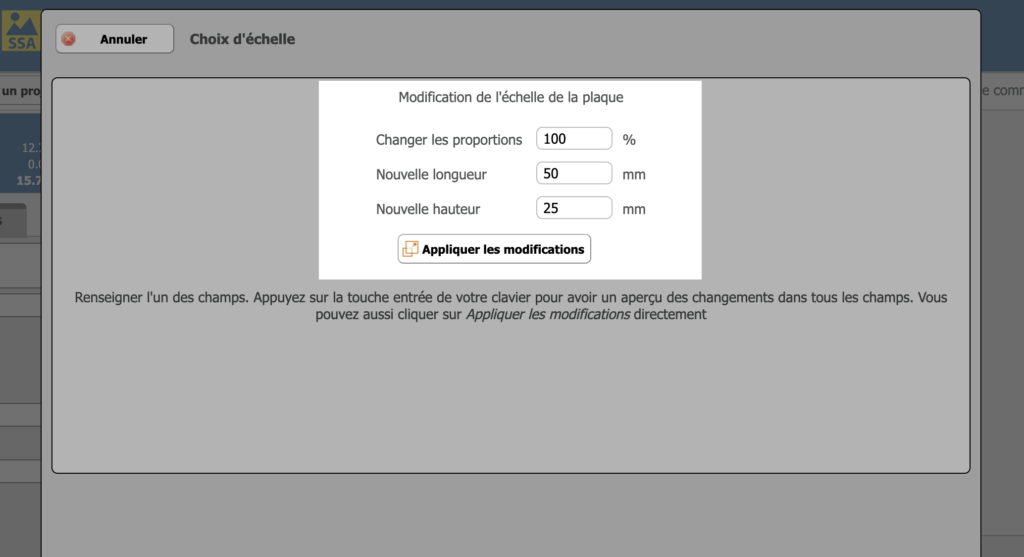 Vous avez terminé une pancarte et vous vous rendez compte qu’elle doit être d’une autre taille ? La fonction “Échelle” est là pour vous aider. Elle vous permet de redimensionner votre plaque tout en conservant automatiquement les proportions de tous les éléments de la zone de travail.